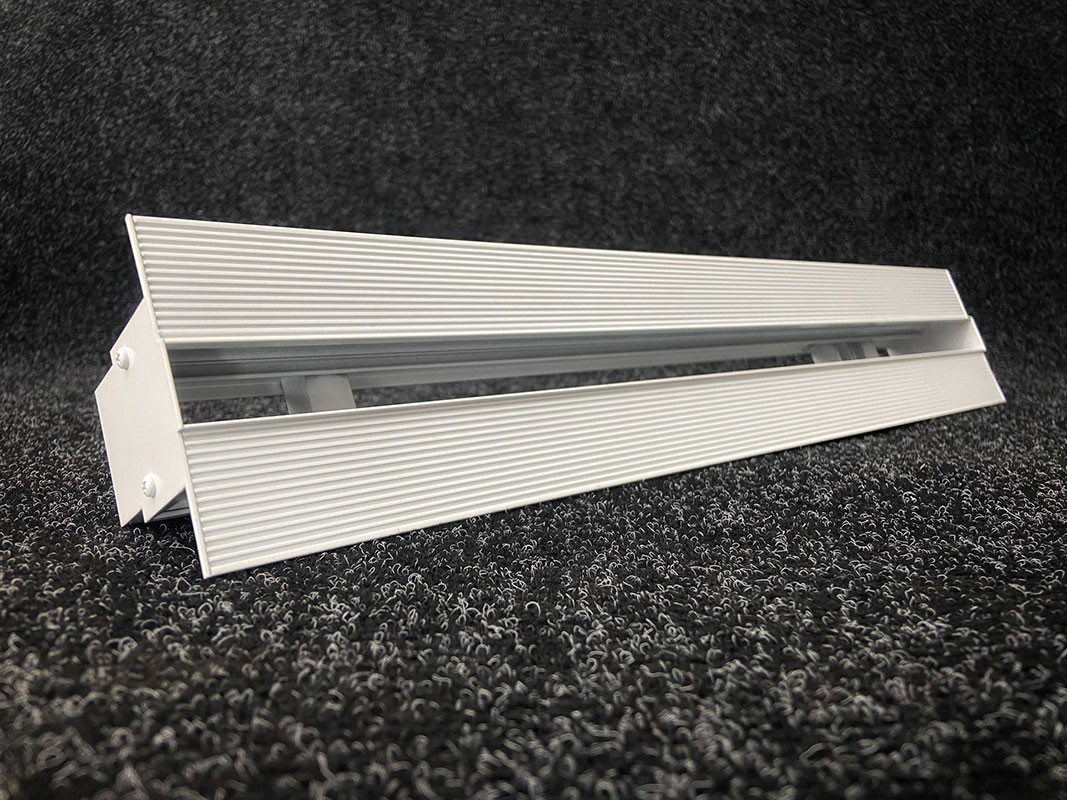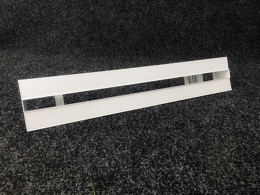 Конструкция профиля решетки предусматривает фланец с углублениями и отверстиями для лучшей адгезии финишного материала по длине решетки и заглушки с торца. После монтажа решетки, видимой частью в помещении остаются только щели.