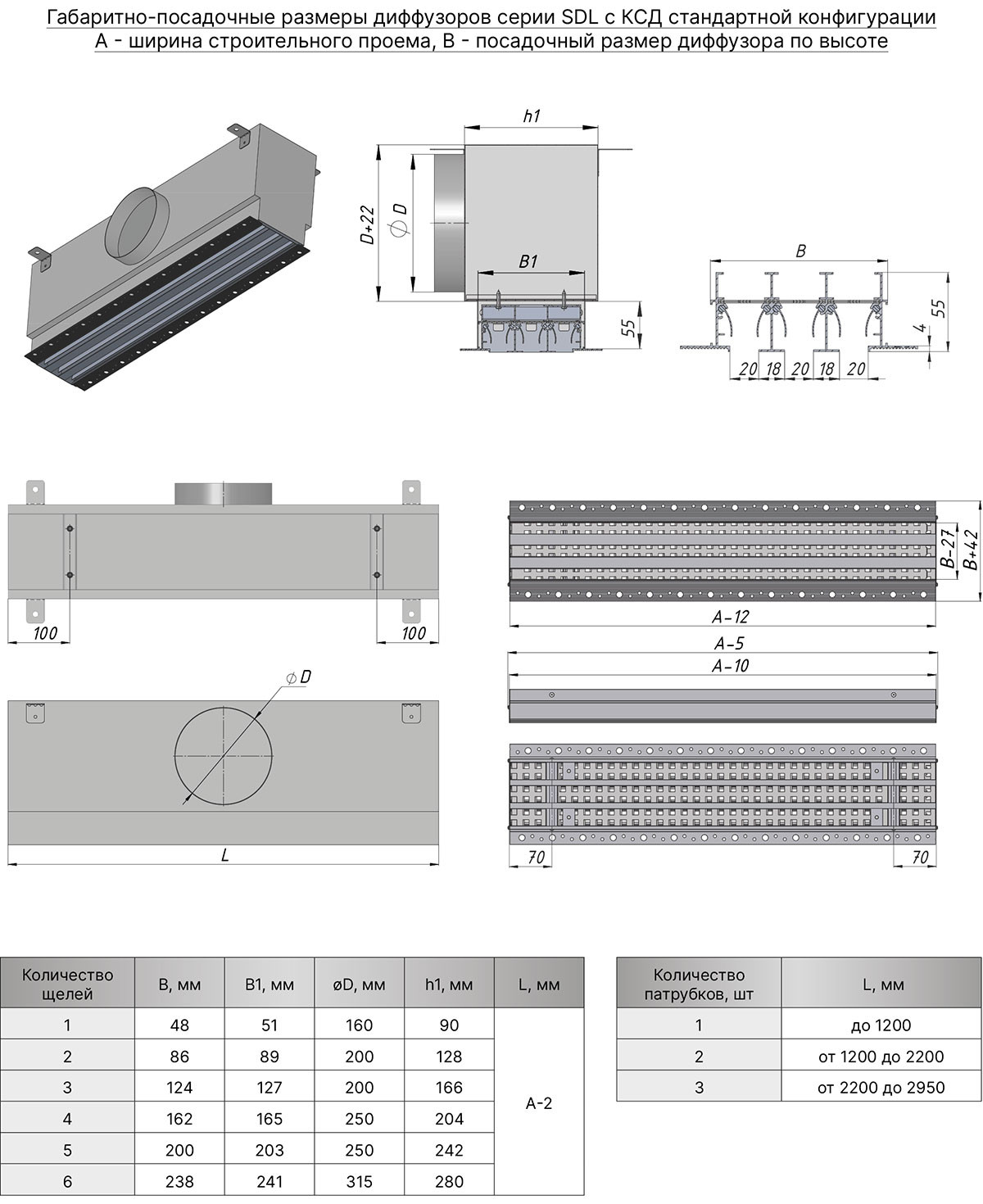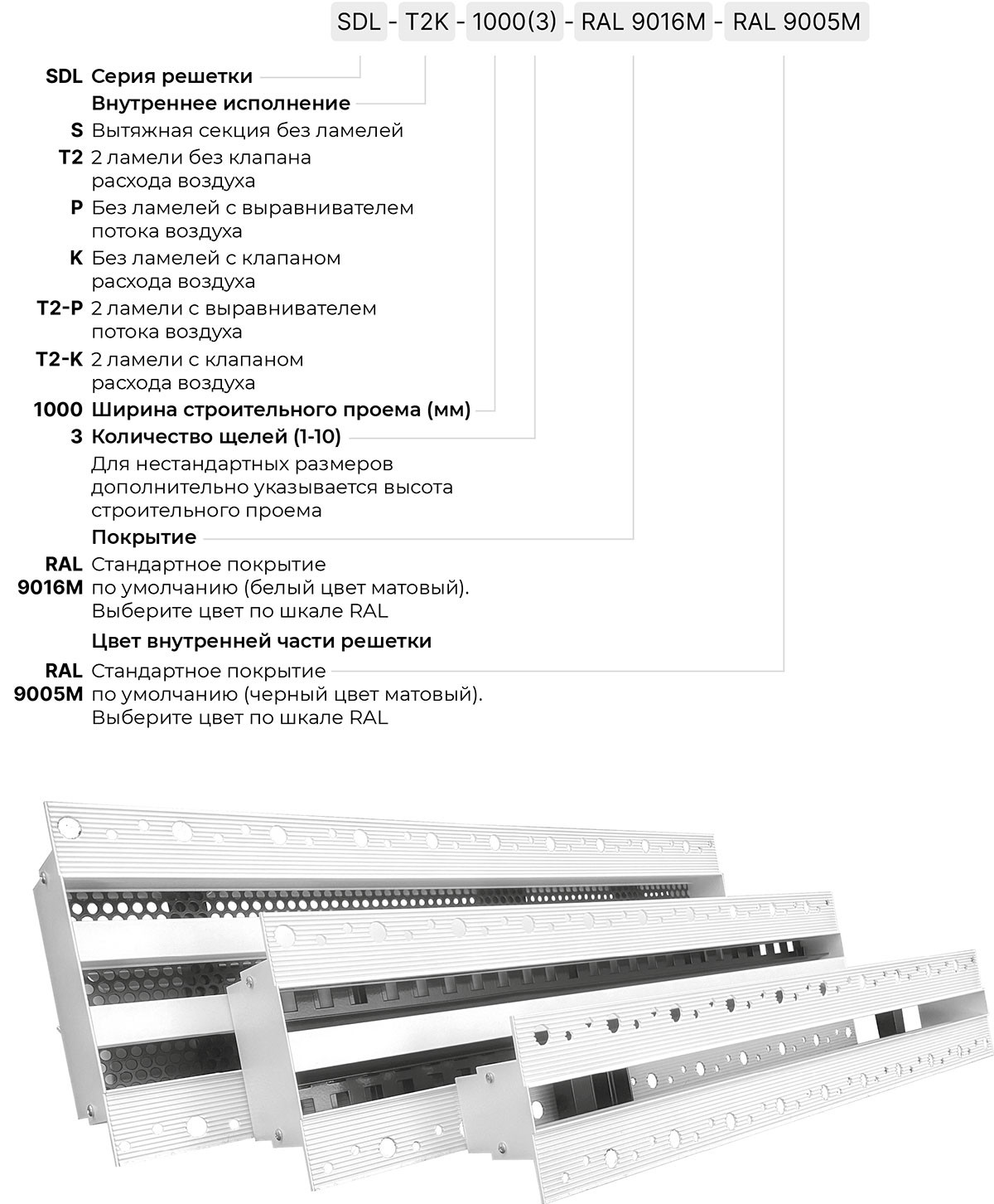 Щелевые решетки SDL изготавливаются из экструдированного алюминиевого профиля АД31 по ГОСТ 22233-2018. По умолчанию корпус решетки окрашивается в стандартный белый цвет RAL 9016М матовый, а внутреннее исполнение в чёрный цвет RAL9005М матовый. По индивидуальному заказу возможна окраска в любой цвет по шкале RAL. Статическая камера изготавливается из оцинкованной листовой стали 0,4 - 1,5 мм в зависимости от размера и пожелания заказчика. По умолчанию КСД поставляется в неокрашенном виде.
